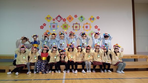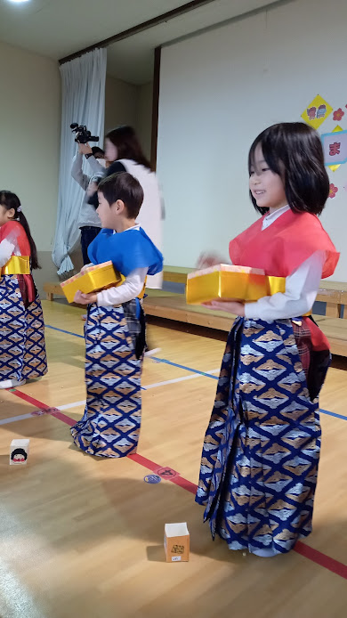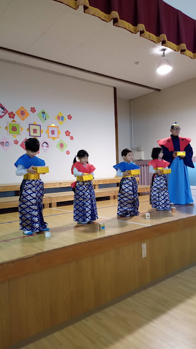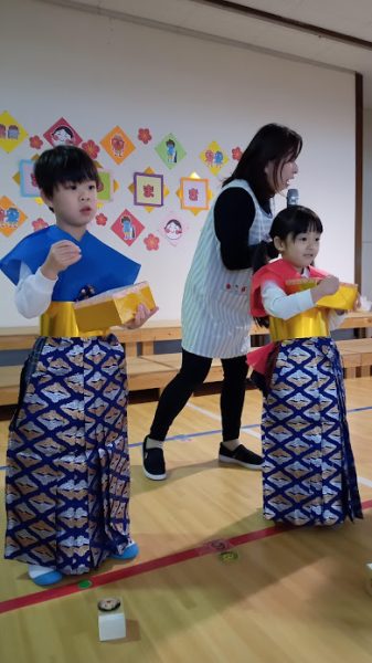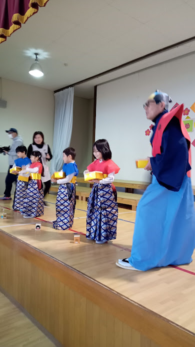 その後、2月生まれのお友だちと園長が「福の神」になって登壇しました。