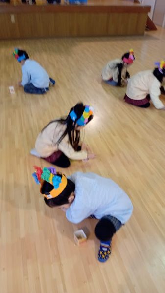 福の神が大きな声で「おにはーそと!」「ふくはーうち」と言いながらまいた豆を、みんなで拾いました。