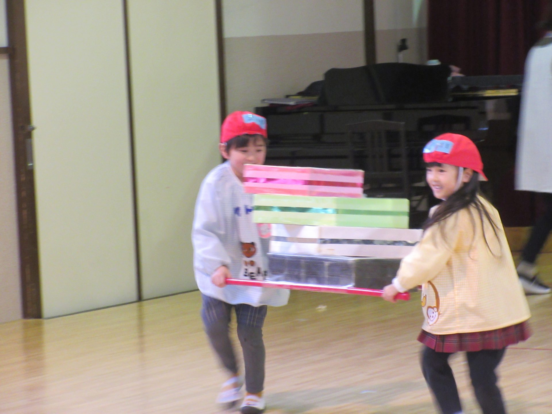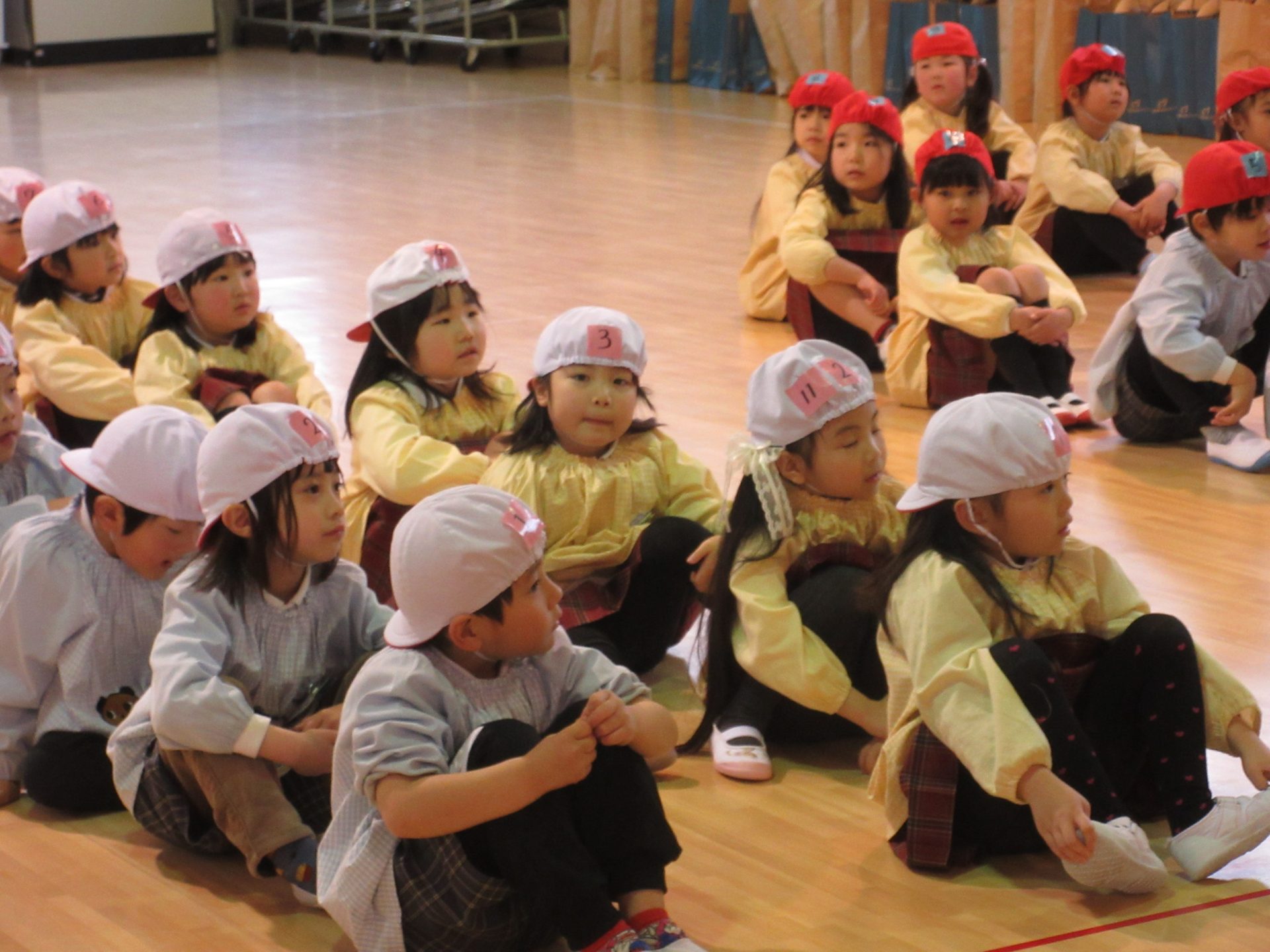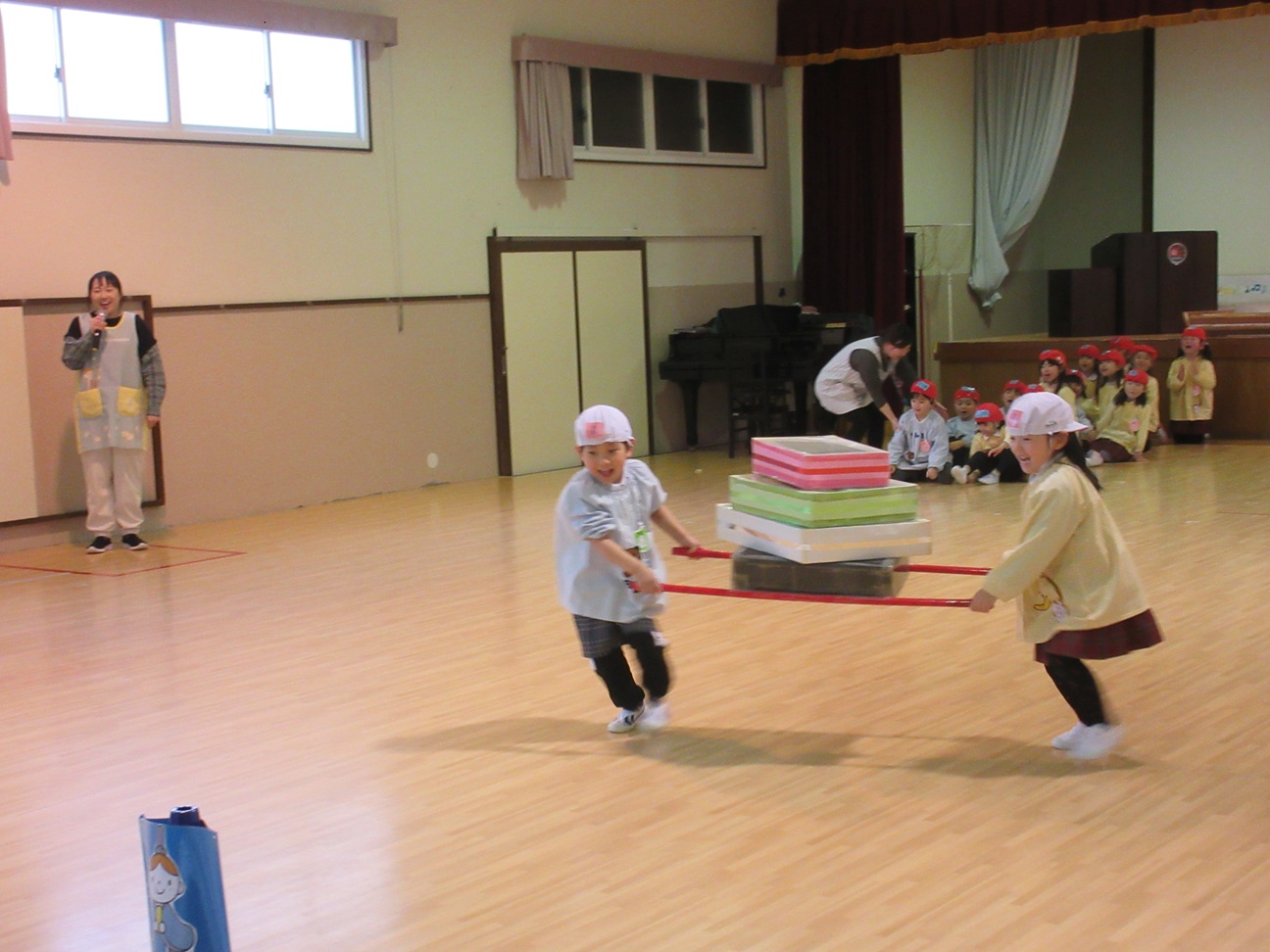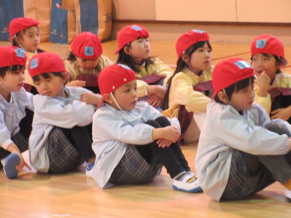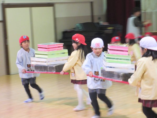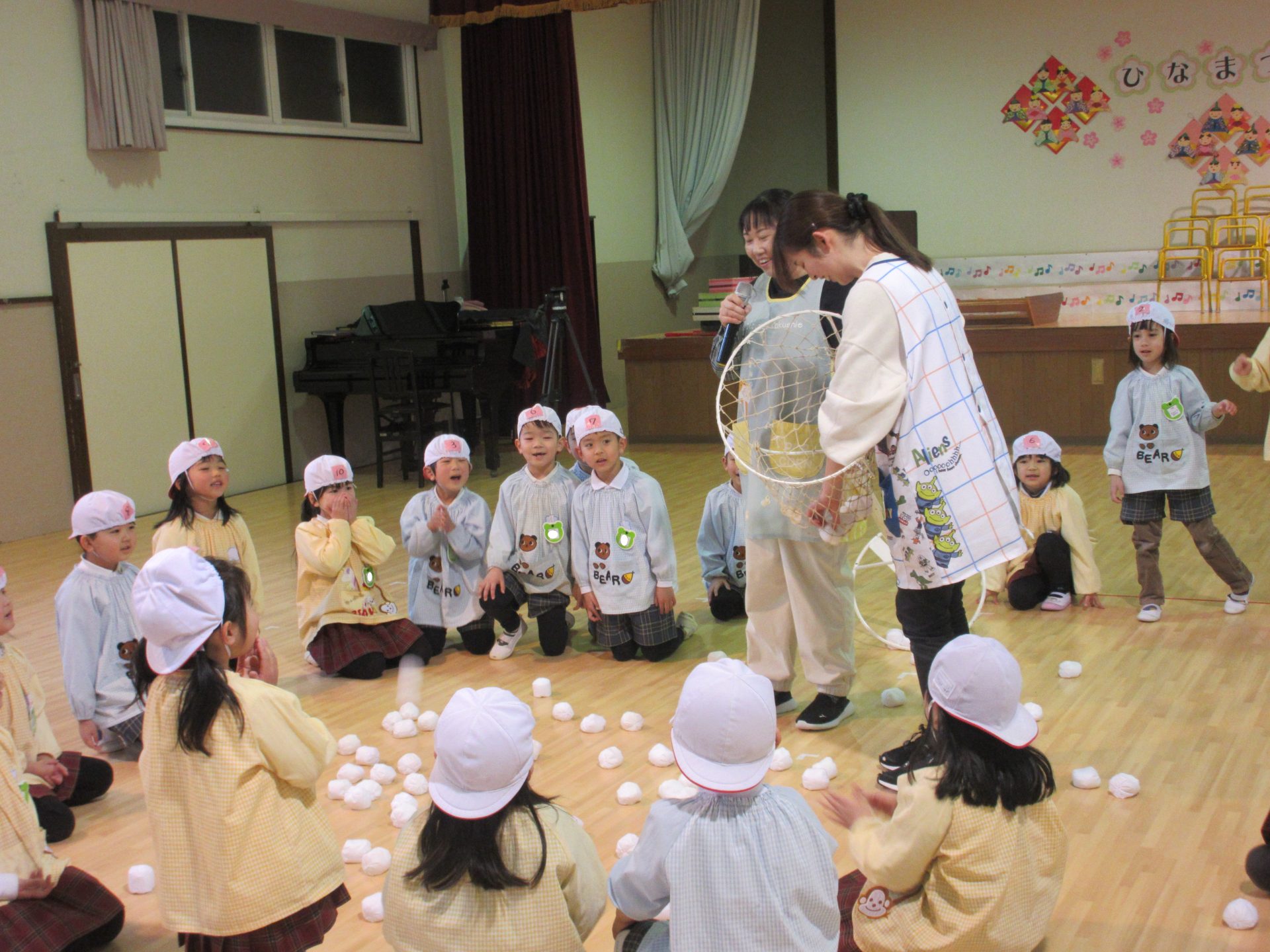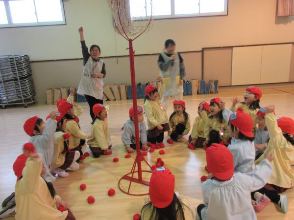 年長さんは体育館に集まり、ひなまつりの由来を聞いた後、ひしもち運びリレーや玉入れのゲームを行いました。