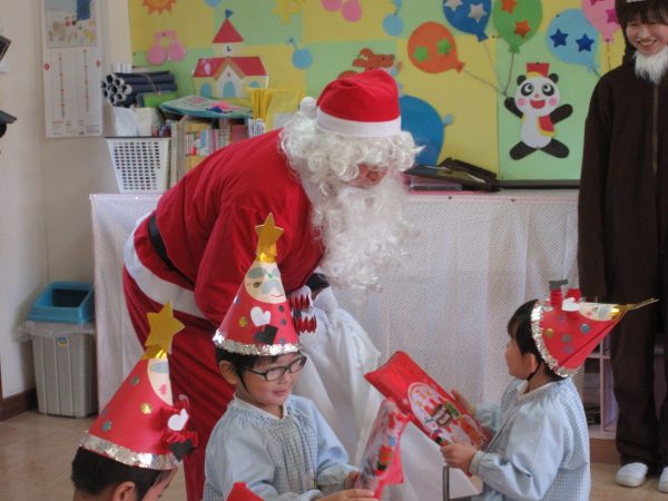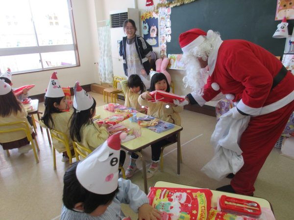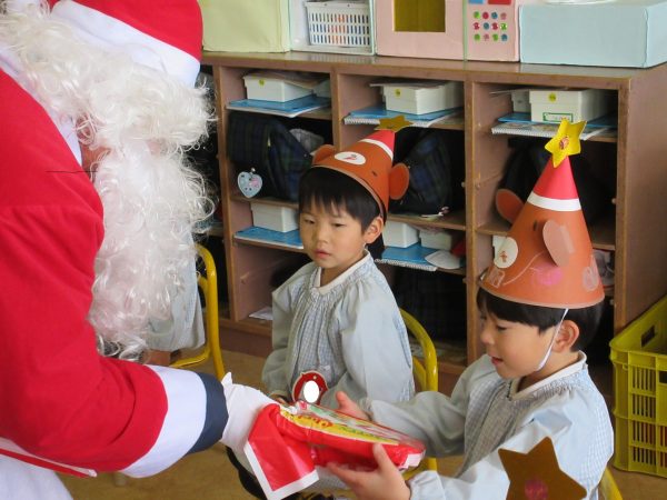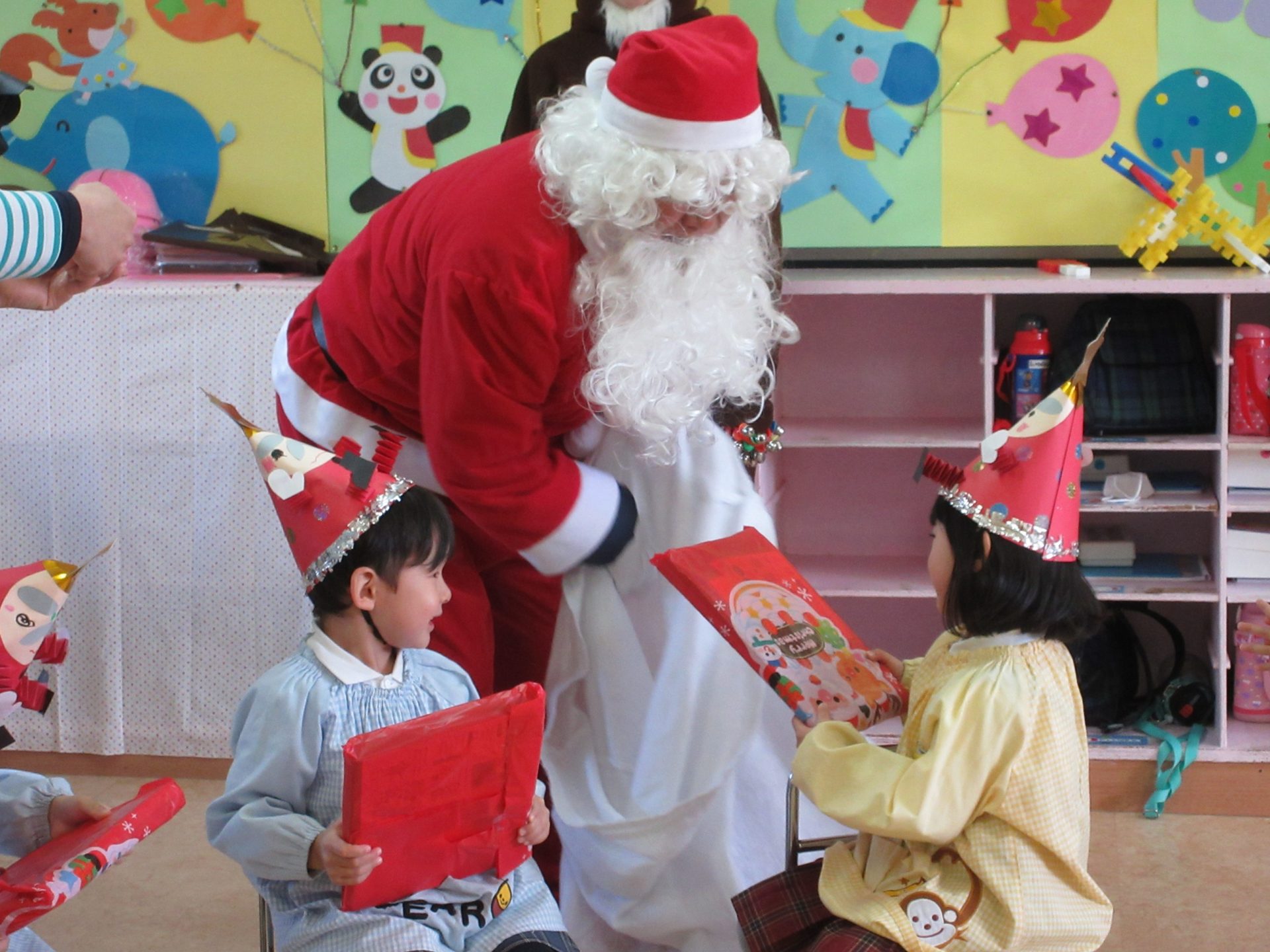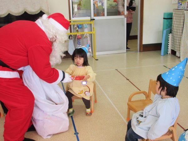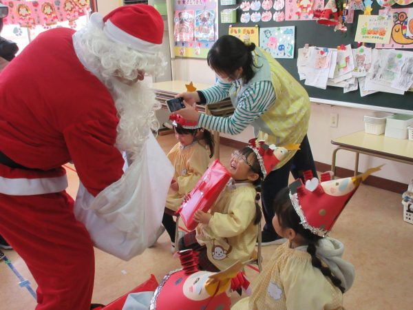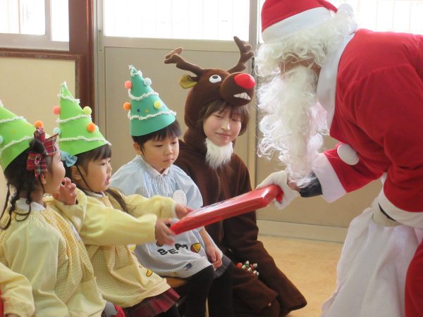 サンタさんからプレゼントをもらい、大喜びの子どもたち。