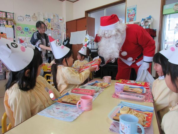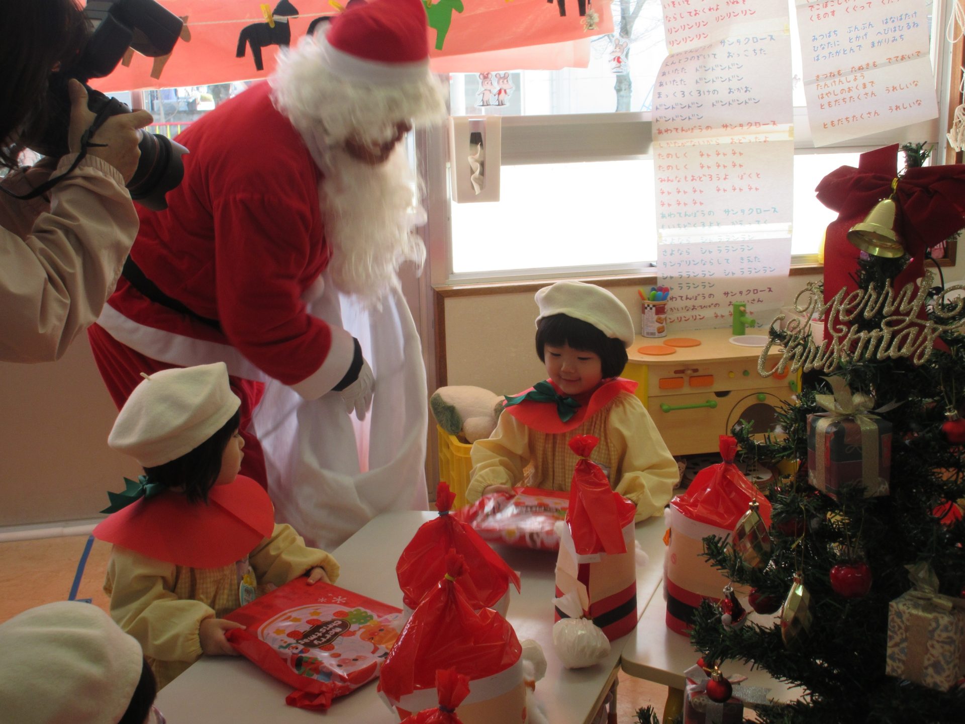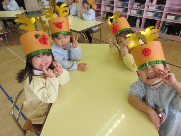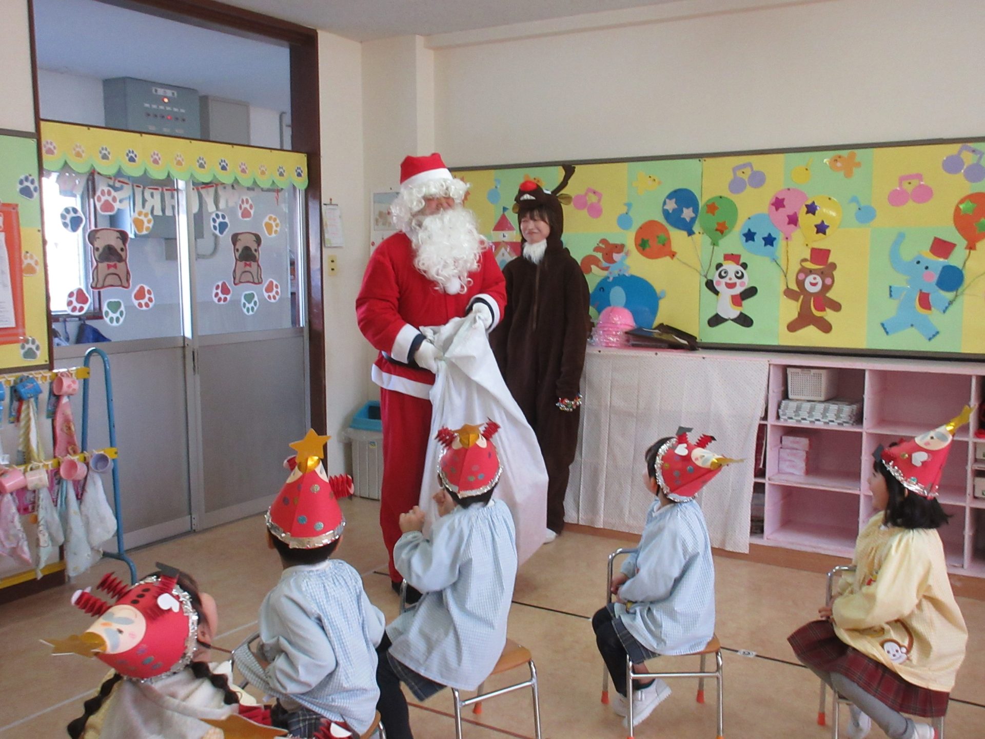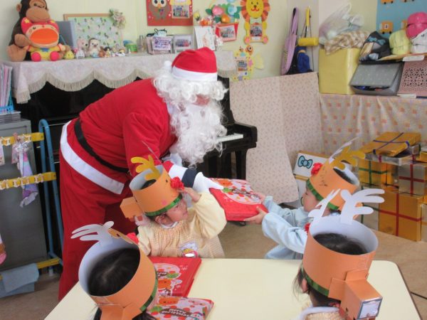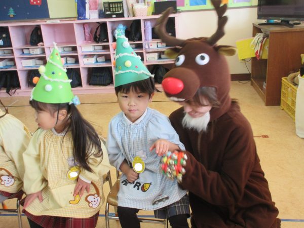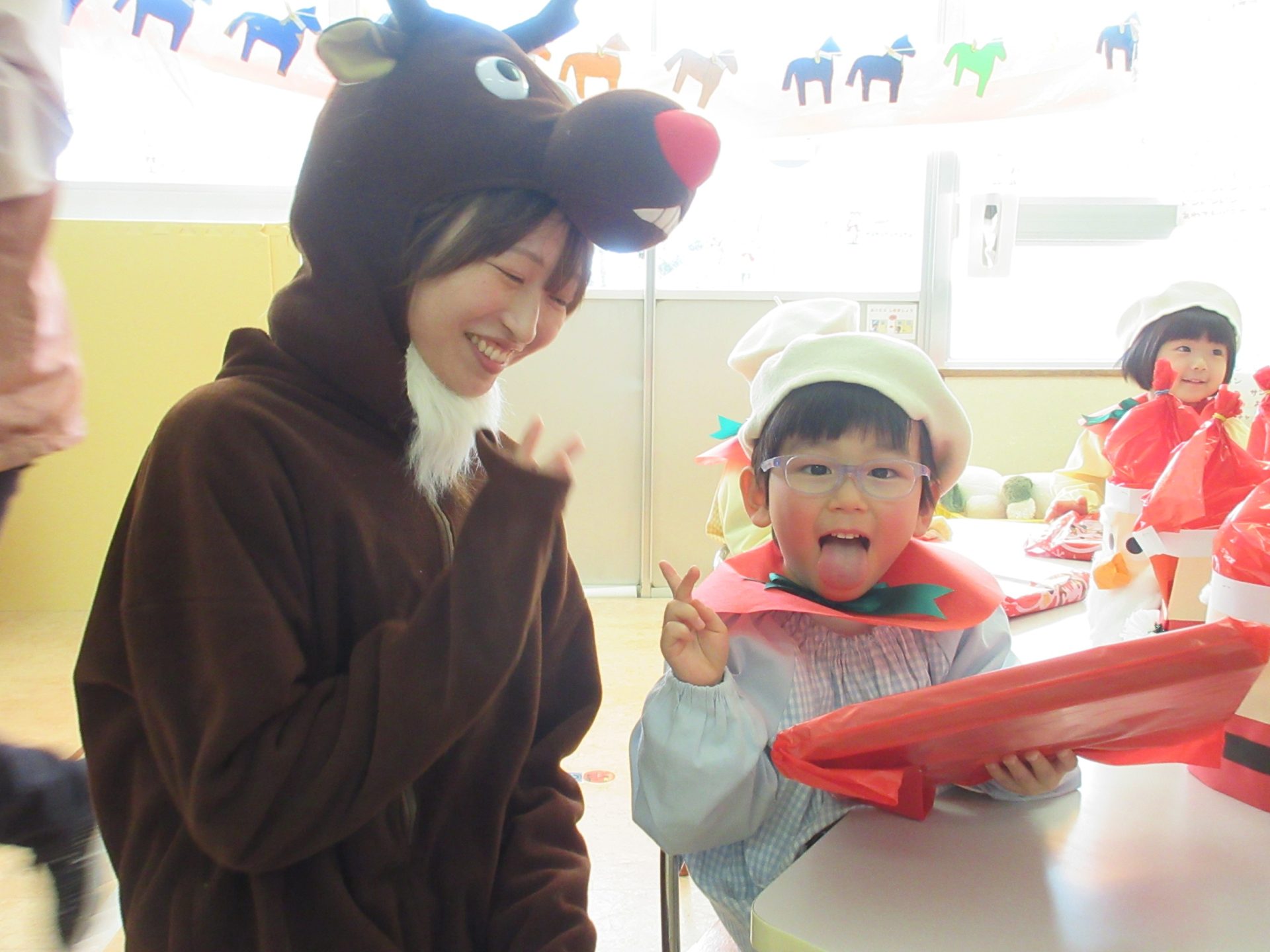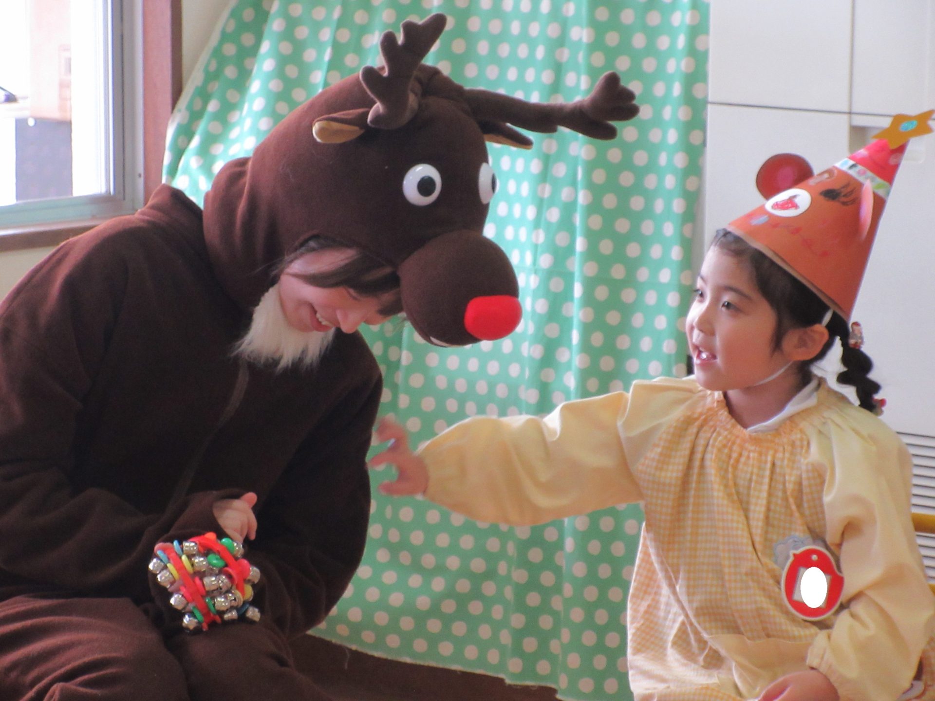 クリスマスの歌を歌ったりゲームをしたりお菓子を食べたりしている各お部屋に、トナカイさんとサンタさんがやってきました。