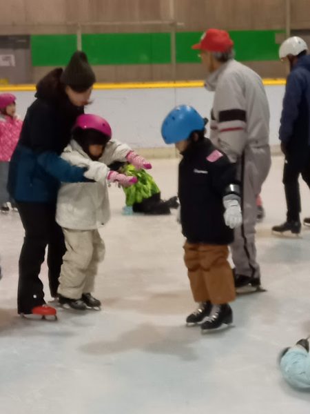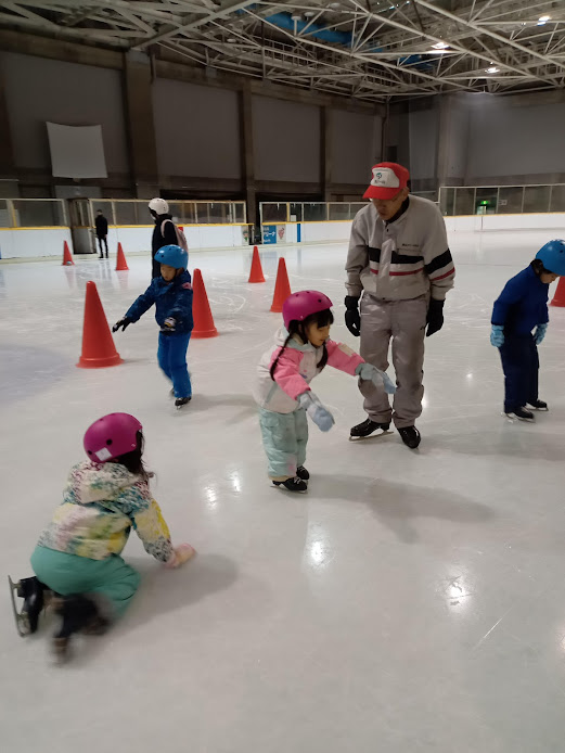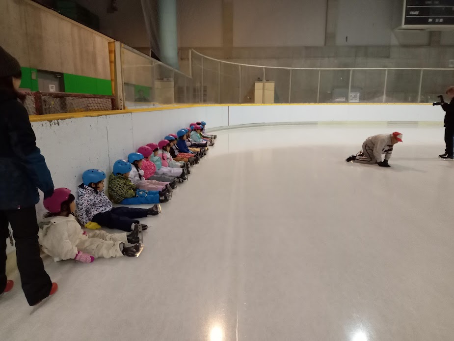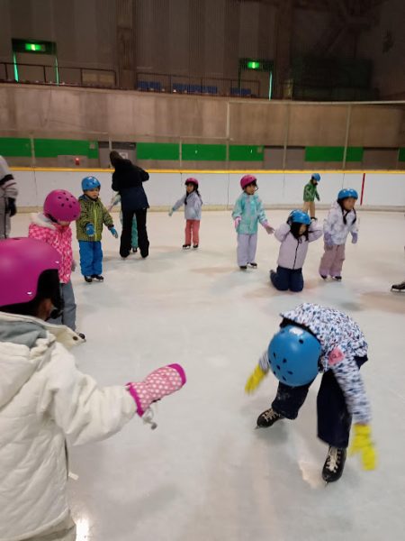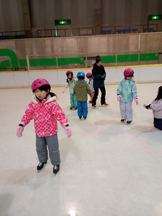 年中さんの時のスケート教室以来という子も多く、最初はどきどきの様子も見られましたが、インストラクターや体育教室の先生に教えていただくと、徐々に立ったり歩いたりできるようになってきました。