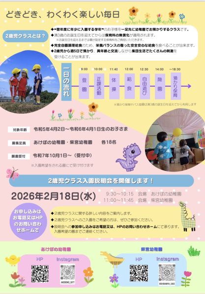 令和8年度2歳児クラス(4年保育)クラスの新規受付を行っています。