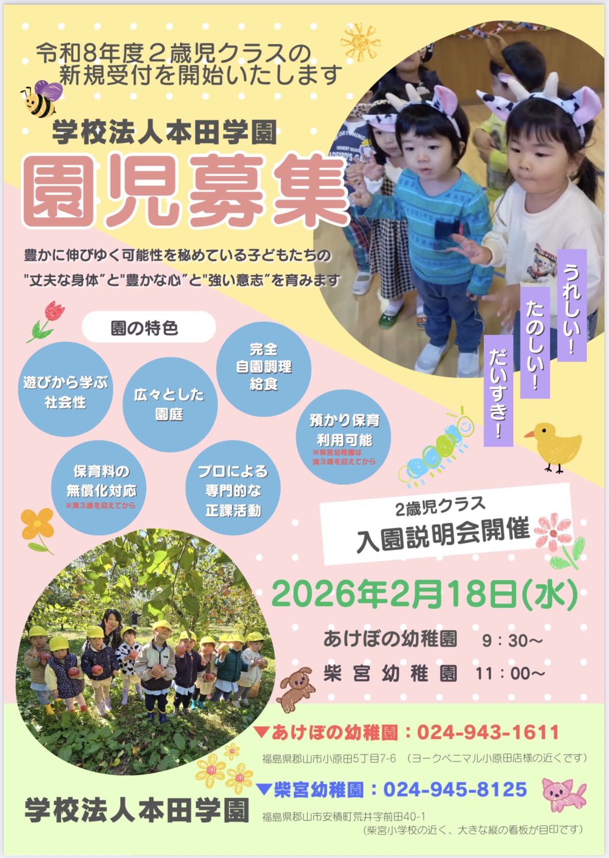 〇募集定員 あけぼの幼稚園・柴宮幼稚園 各18名
